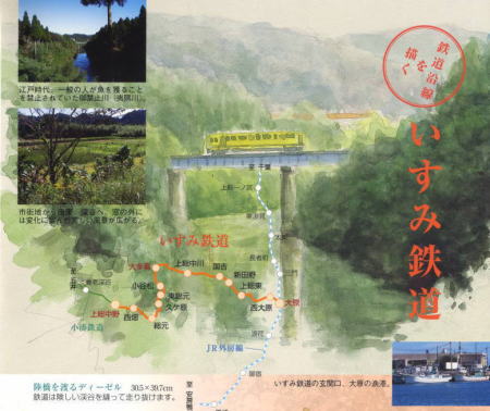 | いすみ鉄道は国鉄時代、木原線と呼びました。荒々しい外海の大原を出発したディーゼルはのどかな田園を走り抜けます。城下町・大多喜を過ぎた辺りから山間にさしかかり、険しく蛇行する渓流・夷隅川を縫うように進み、やがて終点の上総中野に着きます。通学に利用した当時を偲びながら沿線をスケッチしてみました。(2001.2) |